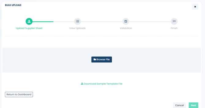 - Download the sample template file and complete all required fields. When finished, save the file and upload it using the Browse File icon, clicking Next, once completed.