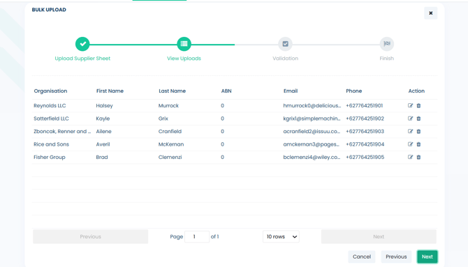 - From here, a list of debtors from the Excel file will be displayed. Please review each entry to ensure the data has been uploaded correctly. To edit or remove a debtor, use the corresponding icons on the right-hand side of the debtor list. Once you have finalised the debtor list, click Next to continue.