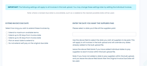 - Date you want Suppliers Paid - This is the date you would like Fifo to process payments for your suppliers' invoices. Please note that Fifo has a cutoff time of 1 PM for same-day payments. To ensure that your invoices are included in the same-day processing queue, they must be submitted and meet the necessary criteria before this deadline. You will then see a screen prompting you to enter the payment date for your suppliers and the desired extension of payment terms.You will then see a screen prompting you to enter the payment date for your suppliers and the desired extension of payment terms.
