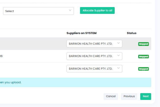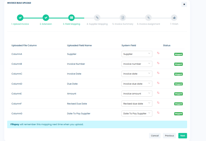 - During your initial Bulk Upload, you will need to map the suppliers of your invoices to the corresponding fields in the system. This step is required only once, as Fifopay will save your mappings for future uploads, streamlining the process for subsequent submissions.