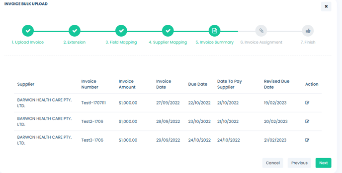 - You will then be shown an Invoice Summary that includes all the invoices you are submitting for payment. It is important to verify that this information accurately reflects the invoices you intend to submit. If any details need to be corrected, simply click the Edit icon in the actions column. Additionally, if there are any issues with your submissions, Fifopay will highlight them with red font notes for your attention.