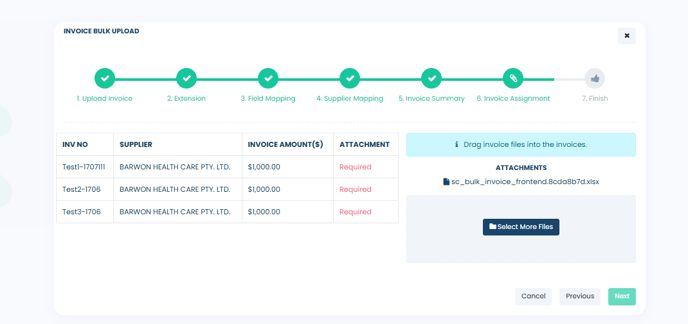 - In the final step, you will need to upload the invoice attachments for each invoice you are submitting. Click on "Select More Files" to upload the PDFs for each invoice. Once uploaded, these files will be displayed, allowing you to easily drag them to their corresponding invoices. Additionally, you can include multiple attachments for each invoice transaction if necessary.