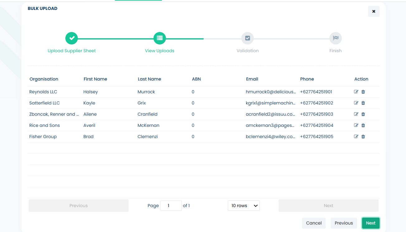 - From here, a list of suppliers from the Excel file will be displayed. Please review each entry to ensure the data has been uploaded correctly. To edit or remove a supplier, use the corresponding icons on the right-hand side of the supplier list. Once you have finalised the supplier list, click Next to continue.