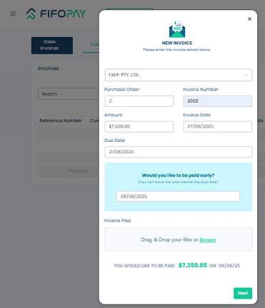 Getting paid early is now as simple as uploading an invoice onto Fifopay and selecting a payment date.