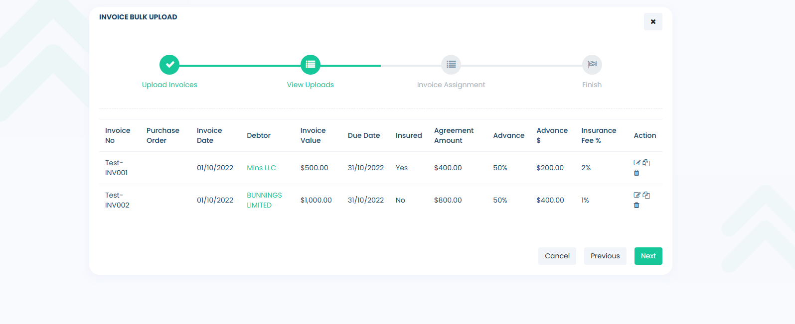 - From here, a list of invoices from the Excel file will be displayed. Please review each entry to ensure the data has been uploaded correctly. To edit or remove a debtor, use the corresponding icons on the right-hand side of the debtor list. Once you have finalised the debtor list, click Next to continue.