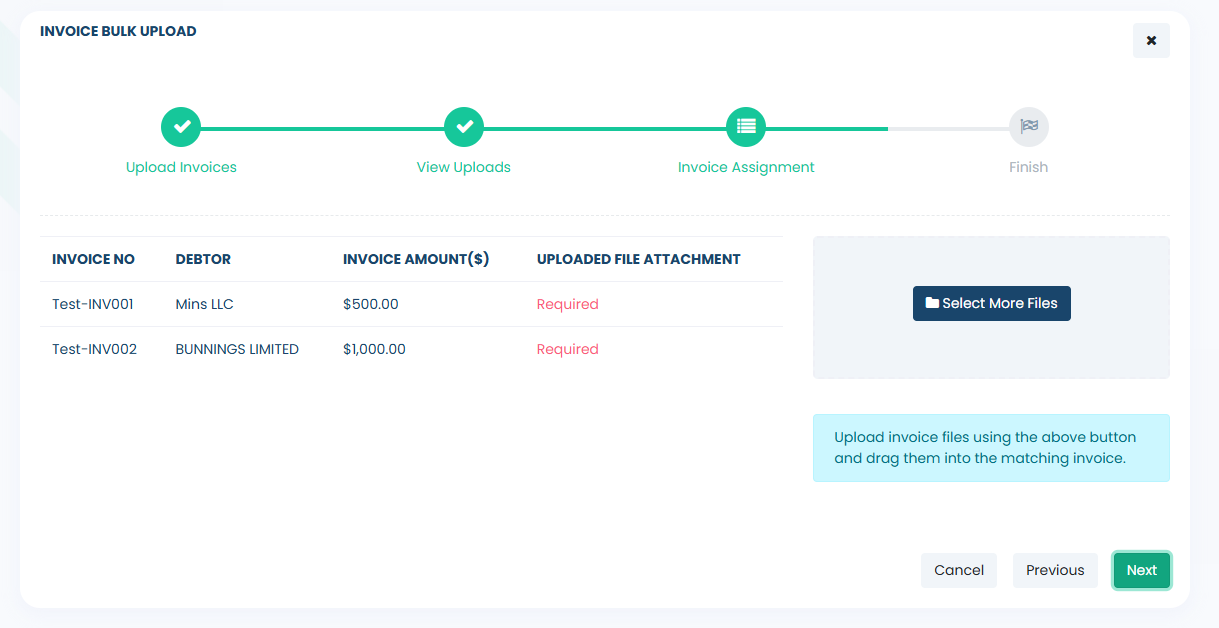 - In the final step, you will need to upload the invoice attachments for each invoice you are submitting. Click on "Select More Files" to upload the PDFs for each invoice. Once uploaded, these files will be displayed, allowing you to easily drag them to their corresponding invoices. Additionally, you can include multiple attachments for each invoice transaction if necessary.