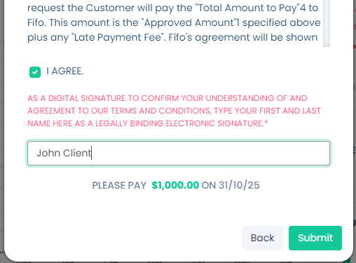 Step 3 - Now, take a moment to enter the details just as they appear on the invoice. Don't forget to select a Revised Due Date, which is the date you plan to pay the invoice and any outstanding fees (to Fifo Capital).
